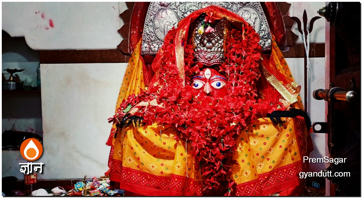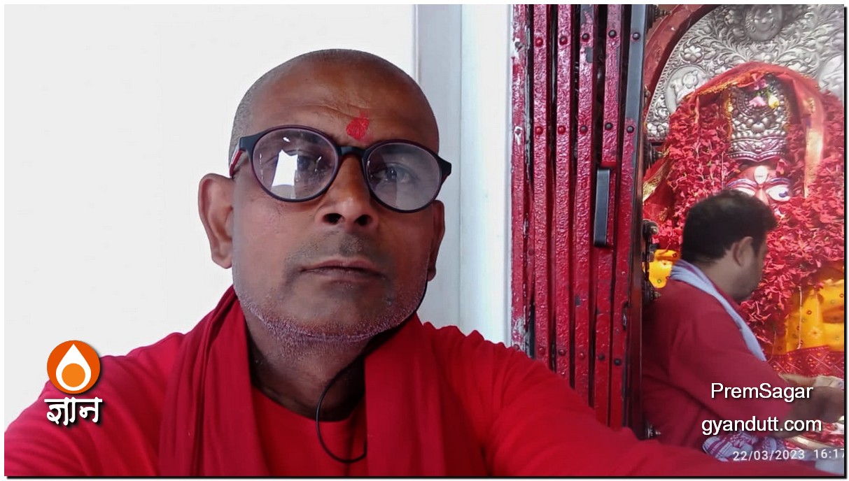 “मंदिर एकांत है भईया। साफ सुथरा। मन को अच्छा लगता है वहां। भीड़ भी बहुत ज्यादा नहीं थी। नवरात्रि का प्रारम्भ है तो कुछ तो लोग थे ही। भईया, यहां सती माई का गला गिरा हुआ था। यहां भैरव हैं – योगेश। आप को बता दे रहा हूं, काहे कि बाद में हो सकता है भूल जाऊं।” – प्रेमसागर ने शाम साढ़े चार बजे कहा। मैं हर बार उनसे शक्तिपीठ के भैरव का नाम पूछता हूं और यह भी कि भैरव के दर्शन किये हैं या नहीं। शक्तिपीठ अनेक हैं। कुछ लोगों ने कालांतर में और भी जोड़ लिये हैं। भैरव और उनका मंदिर संलग्न होने से शक्तिपीठ की प्राचीनता का आभास मुझे होता है।