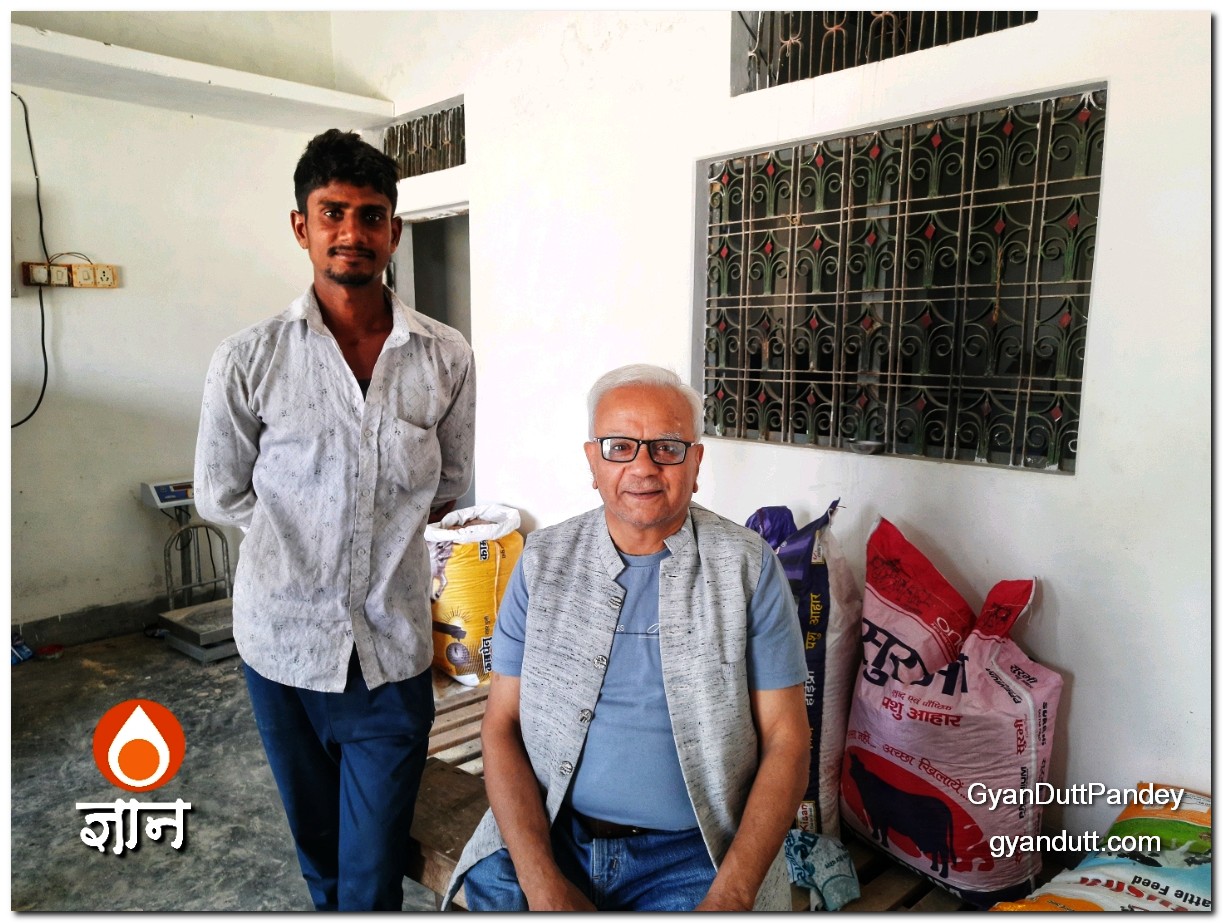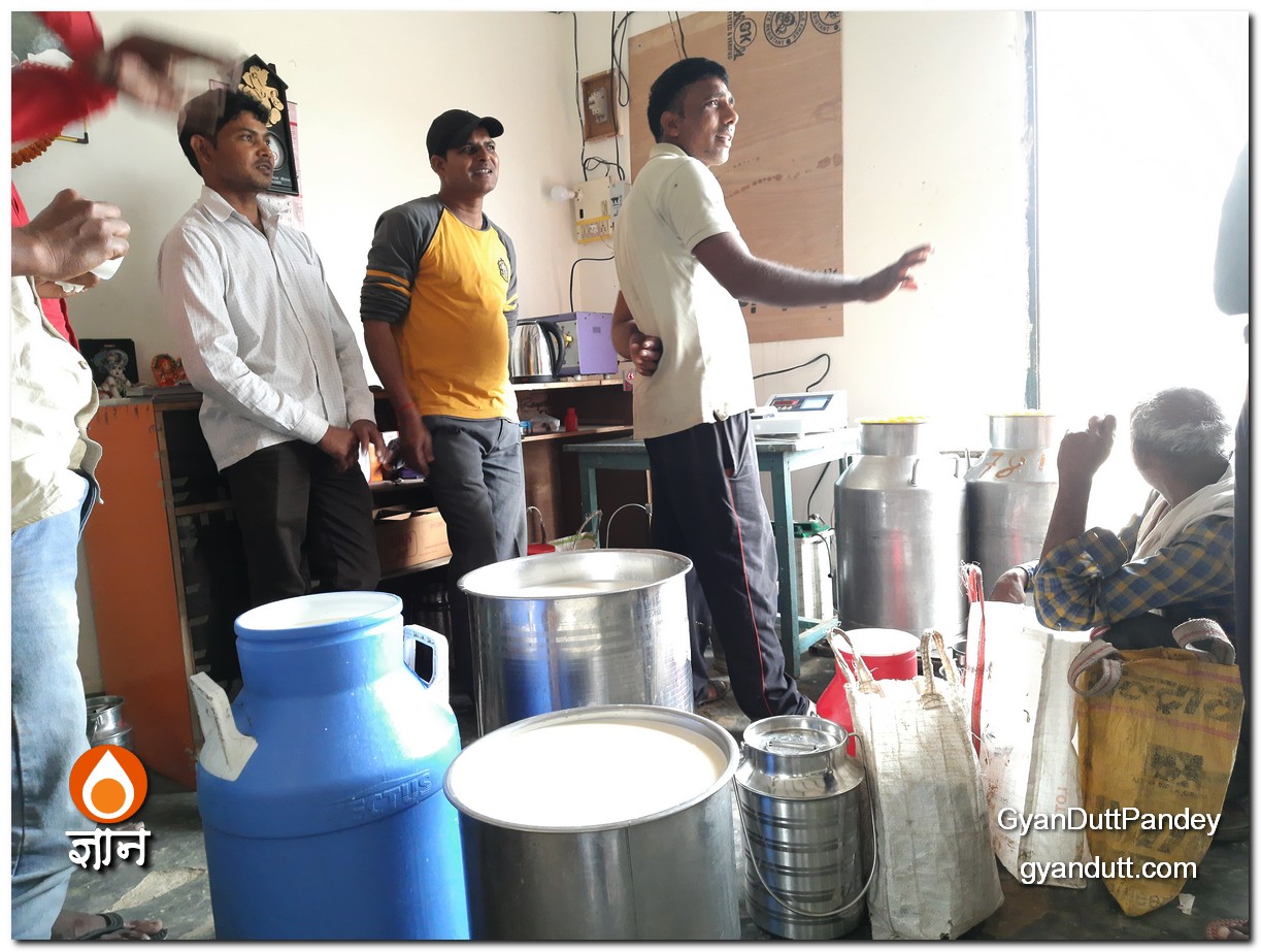 मडैयाँ डेयरी पर दूध लेने जाता हूं मैं। रोज। आम तौर पर बहुत भीड़ रहती है। सवेरे सात बजे से दस बजे तक 150 से ऊपर दूध के सेम्पल ले कर किसानों, पशुपालकों से दूध लेते हैं मड़ैयाँ डेयरी के अजय और सुभाष। एक सेम्पल में लगभग एक मिनट का समय लगता है। सेम्पल लेने, उसे मिक्स करने और लैक्टोस्कैन कर उसके फैट के आधार पर उसकी स्लिप निकालने और किसान को कैश में दाम देने में एक मिनट तो कम से कम लगते ही हैं। सिर उठाने को फुर्सत नहीं होती अजय और सुभाष को। मैं थोड़ा ऑफ-पीक ऑवर में जाता हूं, पर तब भी पंद्रह बीस मिनट मुझे इंतजार करना होता है। दूध ले कर आने वालों को भी उतना या उससे ज्यादा इंतजार करना होता है।