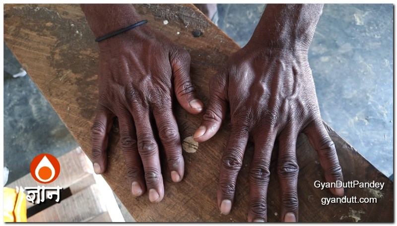 दुधारू पशुओं को दुहना बहुत मेहनत और कौशल का काम है। हर किसी के बस का नहीं। संतोष अपने हाथ दिखाते हैं – दुहने में लगी मेहनत से उनकी उंगलियों की बनावट ही बदल गयी है।