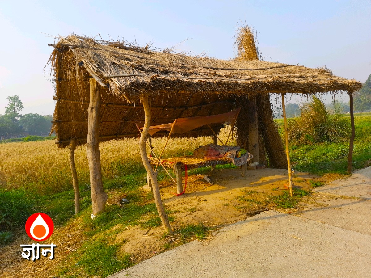 कटका पड़ाव के पास नेशनल हाईवे से सटे फुटपाथ पर थी वह मड़ई। दूसरी ओर गेंहूं का खेत। गेंहू लगभग तैयार। मड़ई का सम्बंध खेत से था या सड़क से – मैं अंदाज नहीं लगा पाया। उसके अंदर एक खाट थी और खाट पर गुनरी बिछी थी। गुनरी पुआल की चटाई जैसी होती है। गद्दे का काम करती है सर्दियों में। बिछाने पर गर्माहट रहती है।