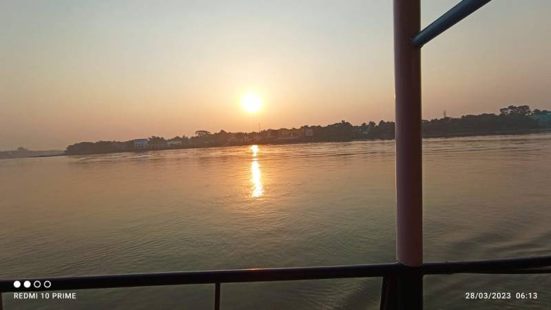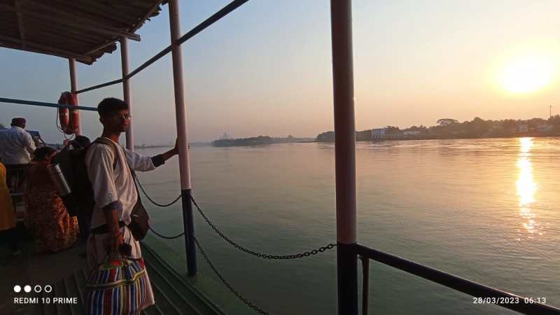 इससे पहले आज सवेरे प्रेमसागर मायापुर से गंगा पार कर नवद्वीप आये। वहां पंहुच कर फोन किया यह बताने के लिये कि मायापुर के क्षेत्र में हुगली नदी पर संगम है – हुगली/गंगा और जालांगी नदी का। जब उन्होने नदी पार करने के लिये फेरी की सवारी की तो उन्होने जालांगी नदी का गंगा में मिलन देखा। जो चित्र सवेरे की रोशनी में हुगली और फेरी के भेजे हैं, उसमें नदी की जलराशि और फेरी की गतिविधियां मनमोहक हैं।