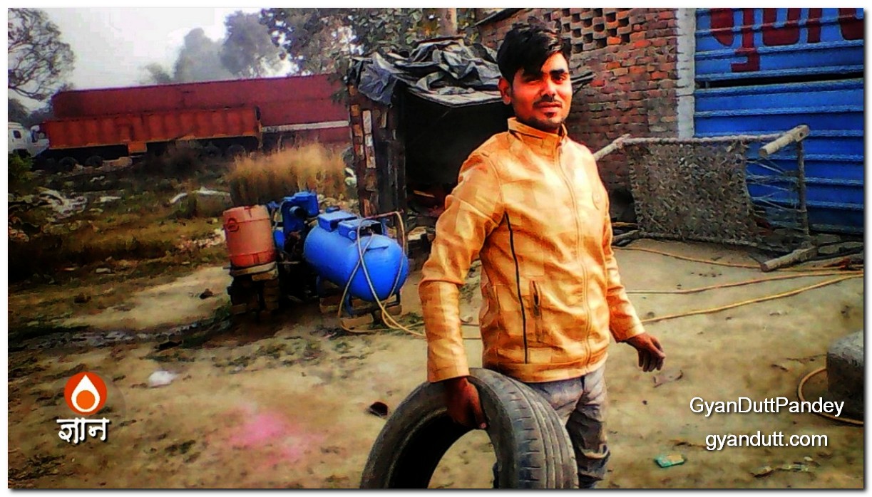 नौजवान है वह। बताता है कि वैशाली, बिहार का है पर पूर्वांचल के इस एरिया में पिछले दस बारह साल से है। मेरे साले साहब का पेट्रोल पम्प कमीशन होने वाला है। उसकी सम्भावना के अनुसार ही बगल में उसने गुमटी खोल ली है। चार चक्का और मोटर साइकिल में हवा चेक कर भरना और यदा कदा पंक्चर बनाने का काम करता है। अभी, जब पेट्रोल पम्प चालू नहीं हुआ है, उसे “कामचलाऊ काम” मिल रहा है। खाने भर को हो जा रहा है, बस। कमाई नहीं है।