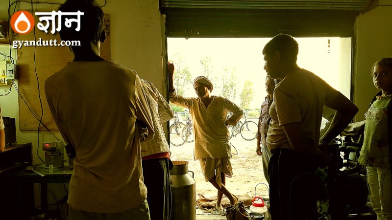 सवेरे छ बजे भी सात आठ लोग थे कलेक्शन सेण्टर पर दूध देने के लिये। वजन लेने के प्लेटफार्म पर भी 50-60 लीटर दूध था कैन-कण्डाल में। लोग और जल्दी आना शुरू हो गये हैं। सूर्योदय अब पौने छ से पहले होने लगा है।