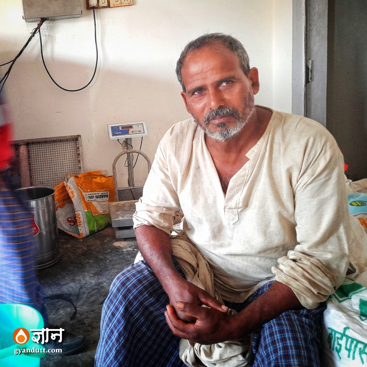 मिश्री पाल पर पोस्ट 2016 में लिखी थी। उसके बाद अब मड़ैयाँ डेयरी पर मिलना हो रहा है आजकल। चौदह अप्रेल को मिले थे। उनपर लिखा भी था। आज फिर मिले। कुर्सी पर बैठे थे। मुझे देख कुर्सी मेरे लिये खाली कर दी और बगल में पशु आहार की बोरी पर बैठ गये।
