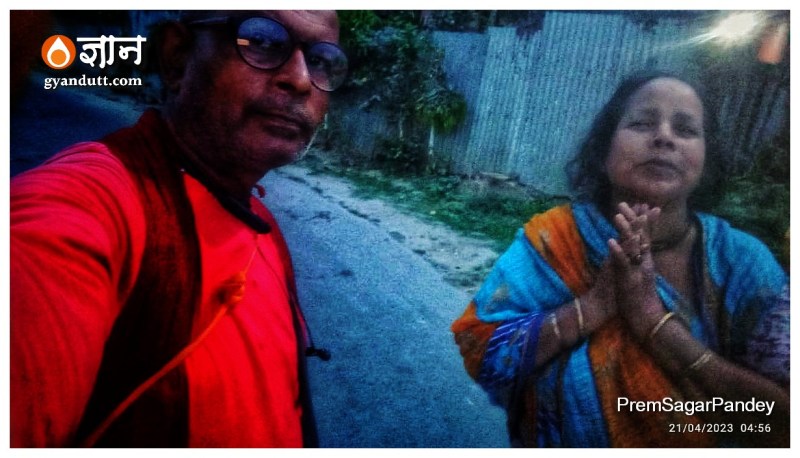 रात में पता चलता है कि वे अधेड़ विधवा हैं। उनका परिवार उनके साथ है। तीन पुत्रियां हैं। साल दो साल पहले उनके पति का निधन हुआ है। शिवजी, काली मां और कृष्ण जी की भक्ति में समय गुजारती हैं। नाम है जुतिका कुण्डू। घर पर उन्होने भोजन करने का अनुरोध किया पर “हम देखे भईया कि बंगाली होने के कारन उनके यहां मछली बनता है। मैंने उनसे कहा कि अगर दूध हो तो दे दें। नहीं तो मैं बाजार से ले आऊंगा। पर उन्होने दूध, केला, चिऊड़ा का प्रबंध किया। खाने में वह अच्छा लगा। … आगे तो भईया आसाम में भी हमें बताया कि लोग मछली-मीट खाने वाले हैं। महादेव जैसे इंतजाम करेंगे, चला जायेगा।”