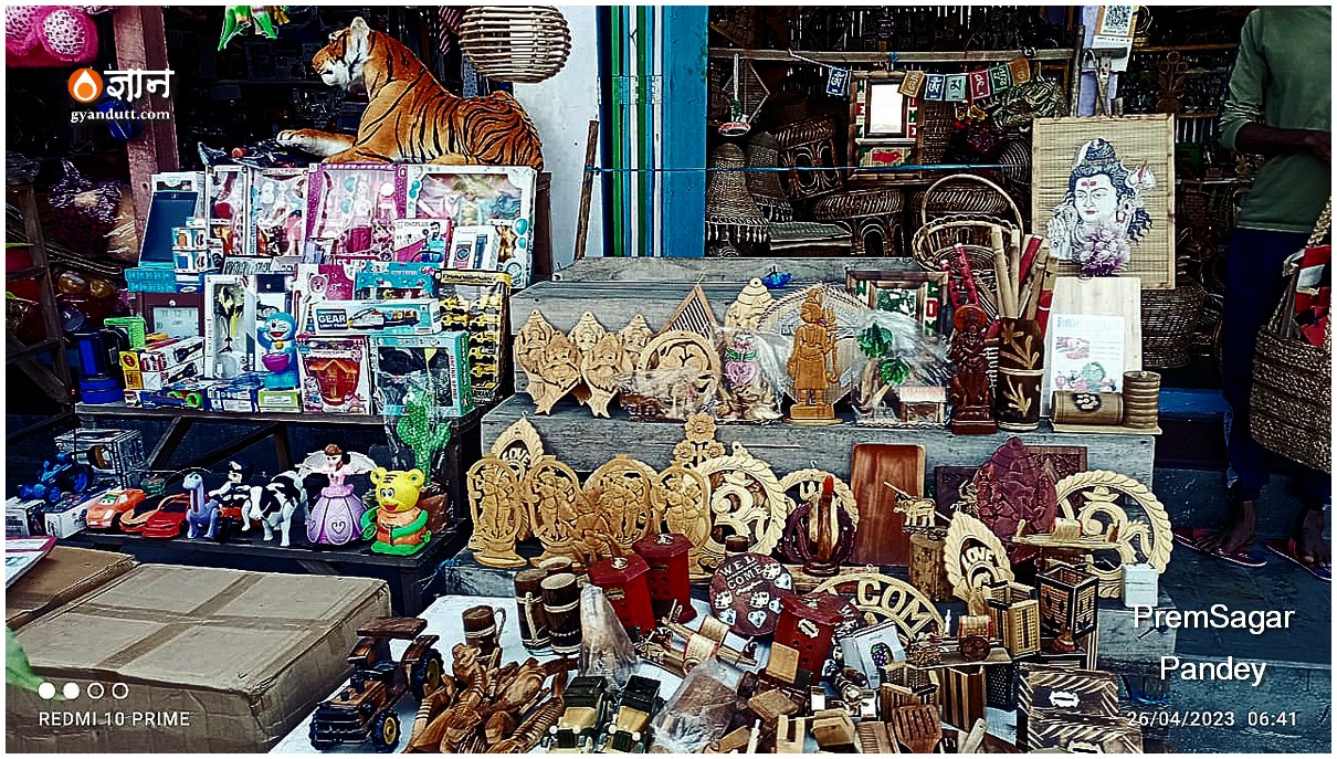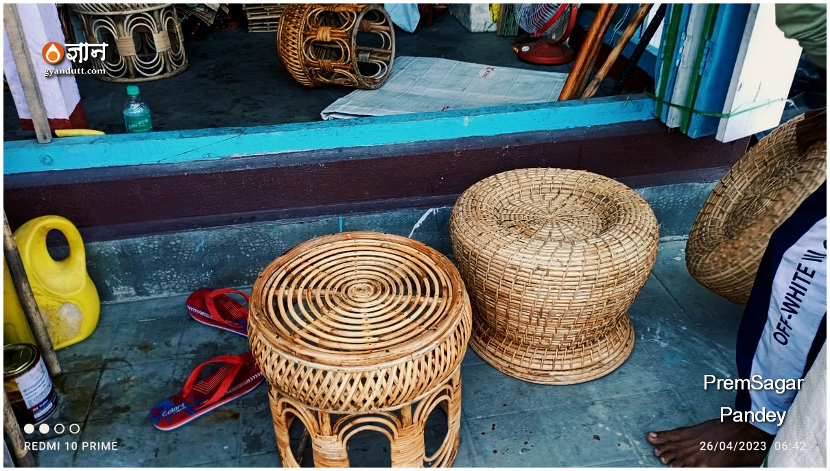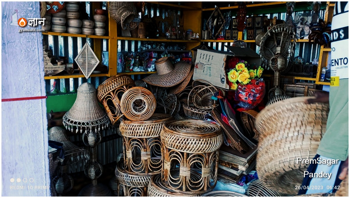 एक दुकान में बेंत का काम दीखता है। बिकाऊ सो-पीस और फर्नीचर।
