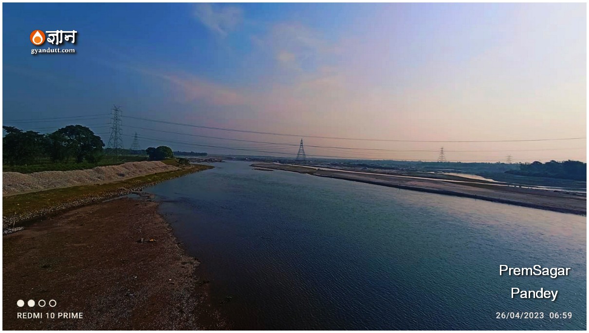 सवेरे सवेरे प्रेमसागर गंगाधर पार करते हैं। उन्हें नदी का नाम नहीं मालुम। नाम मुझे भी नहीं मालुम था। यह ब्लॉग न लिखना होता तो मुझे पता भी न चलता। लिखने के चक्कर में कितना कुछ खोजना पड़ता है। सवेरे सवेरे नदी पार करना सुखद अनुभव है। तीस्ता के सवेरे के दृश्य बहुत सुंदर आये थे। पर गंगाधर कुछ देरी से पार की प्रेमसागर ने। सवेरे नींद कुछ देर से टूटी। बदन अकड़ रहा है। पैरासेटामॉल शायद लिया है या लेना है। देर से पार करने के कारण ऊषा की अरुणिमा नहीं झलक रही जल में। फिर भी, नदी सुंदर तो लगती है!