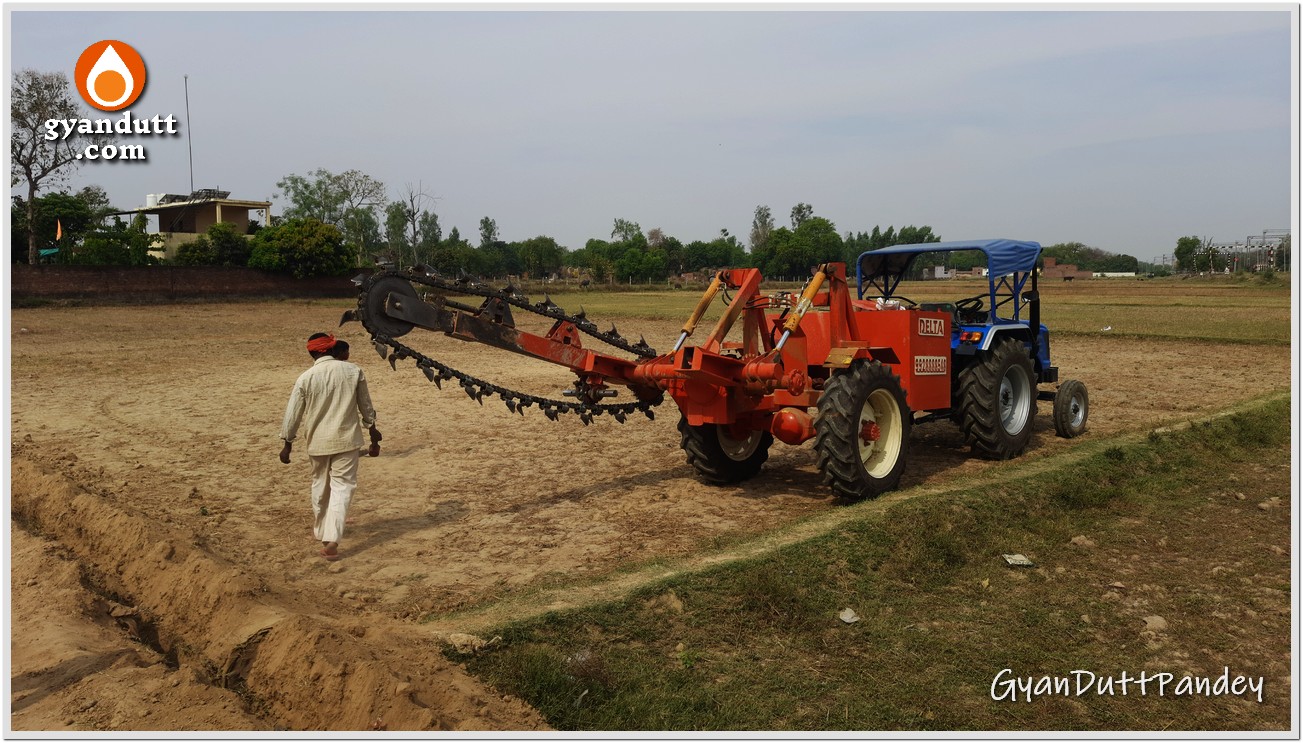 रात में ट्रेंचर एक खेत में खड़ा किया गया है। मेरे घर के बगल में। खेत का अधियरा उस ठेकेदार के आदमी पर रोब गांठ रहा है – खेत खराब नहीं होना चाहिये। ठेकेदार को कायदे से अधियरा को सुरती-पानी का कुछ पैसा दे देना चाहिये।
