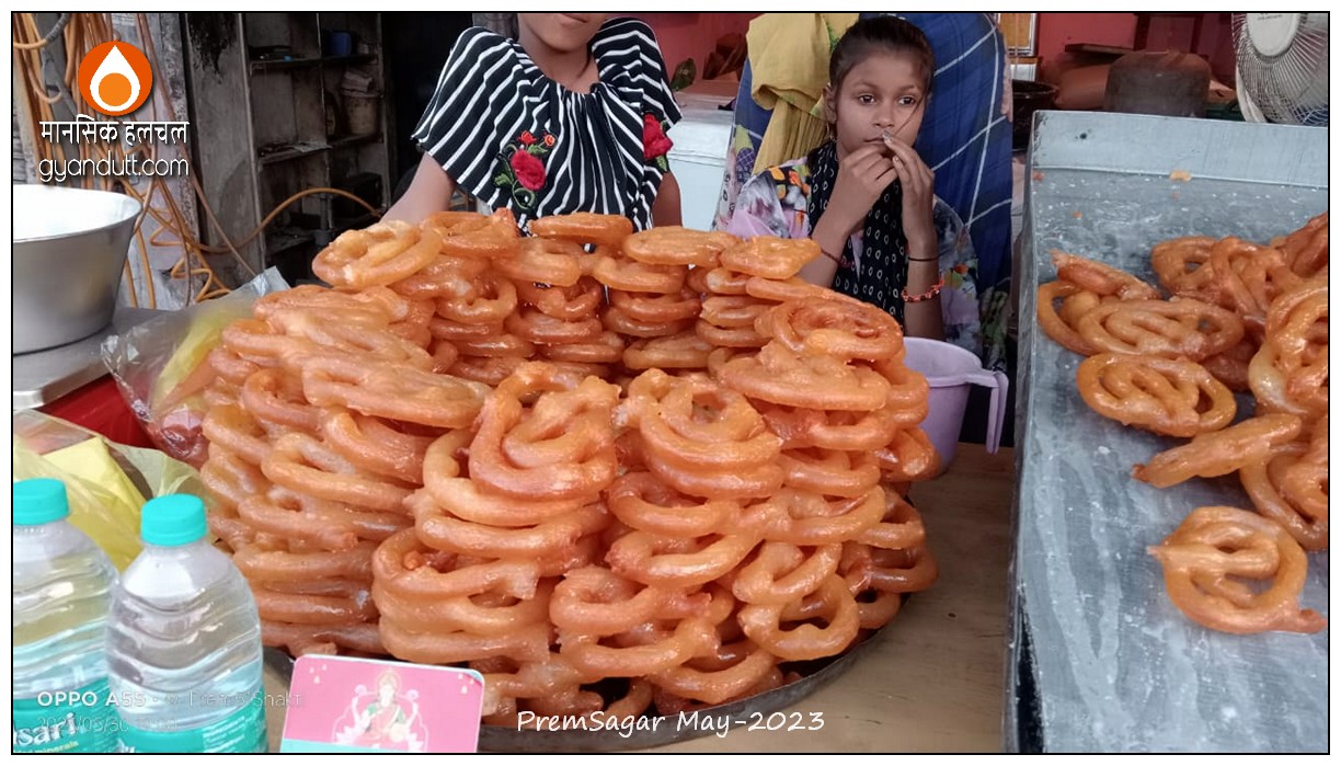 नगर में जलेबा का चित्र भी लिया प्रेमसागर ने। “काफी बड़े साइज की जलेबी है। एक जलेबी का वजन डेढ़ सौ से तीन सौ ग्राम तक है।”