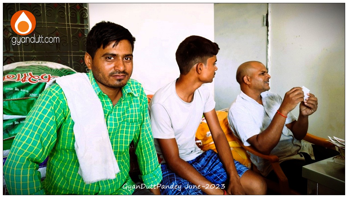 वहां बातचीत में सबसे जानदार दिखते हैं अंजनी दुबे। तिलक लगा रखा है। इकहरा शरीर। गले के गड्ढ़े में भी चंदन का गोल बिंदु लगा है। बोलने में ऐसे कि सभी का ध्यान उनकी ओर चला जाये। बता रहे हैं कि चार गोरू में सवेरे चार बजे से दिन शुरू हो जाता है। गोरू के साथ गोरू की जिंदगी। जिंदगी के लिये जो शब्द उनके मुंह से निकलते हैं उनमें “लत्ता, भूसा” जैसे ही हैं। अर्थात जिंदगी में श्रम है और उसके अलावा कुछ देखने सोचने को है ही नहीं। निश्चय ही, गांव देहात की उस आबादी का हिस्सा हैं अंजनी कुमार दुबे जो मेहनत करती है। उसके फल से लगभग संतुष्ट है पर दिन भर जो पिराई होती है, उसे ले कर यह भाव तो है कि अमीरी होती, ठाठ होता, काम न करना होता तो क्या आनंद रहता।