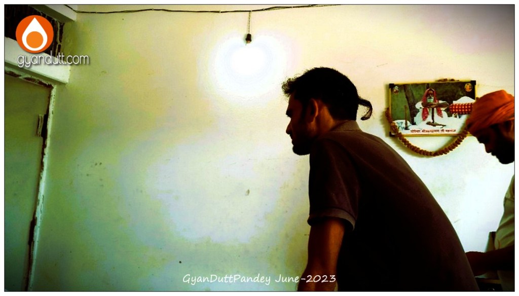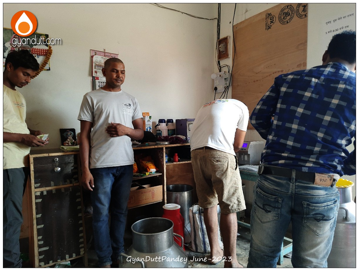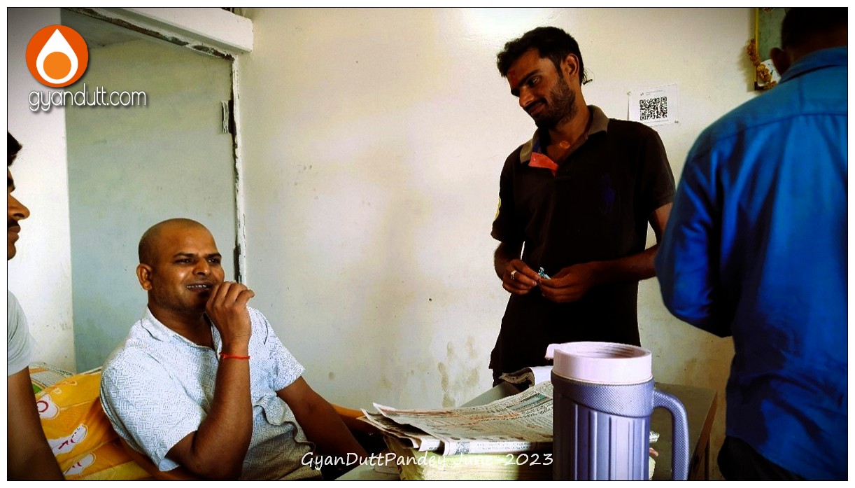 मैं आठ – साढ़े आठ तक जाता हूं सवेरे, मडैयाँ डेयरी के कलेक्शन सेण्टर पर। अजय पटेल जी के यहां पांच सात लोग होते हैं। वे गाय और भैंस का दूध ले कर आये होते हैं बेचने के लिये। मुझे वहां से एक डेढ़ लीटर दूध चाहिये होता है। वहां बतकही चलती रहती है। उनकी देशज अवधी-भोजपुरी ज्यादा समझ नहीं आती, पर अभिप्राय तो पल्ले पड़ ही जाता है। उन लोगों की दुनियां गाय गोरू, खेती किसानी, चूनी-चोकर-सानी आदि के इर्दगिर्द है। स्मार्टफोन और सुरती – दोनो उनके बराबर के काम की चीजें हैं। चैटजीपीटी का नाम सुने भी होंगे तो ज्यादा पल्ले नहीं पड़ा होगा।