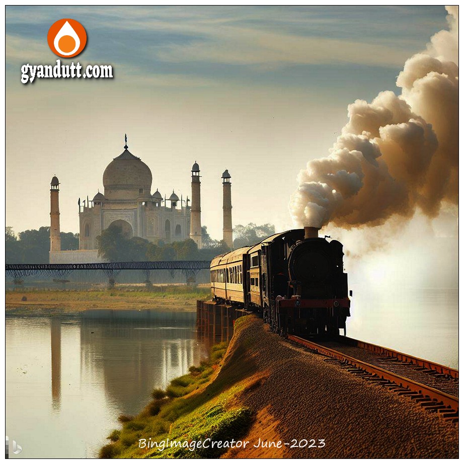 मसलन जब मैंने प्रोबेशनरी अफसर की ट्रेनिंग की थी तो सन 1984-85 का समय था। आगरा में काफी ट्रेनिंग थी। यादों में स्टीम इंजन की गाड़ी, जमुना का पुल और नेपथ्य में ताजमहल की आकृति है। मैंने बिंग पिक्चर जेनरेटर को उस अनुसार चित्र बनाने को कहा और उसने लगभग सही बना दिया!