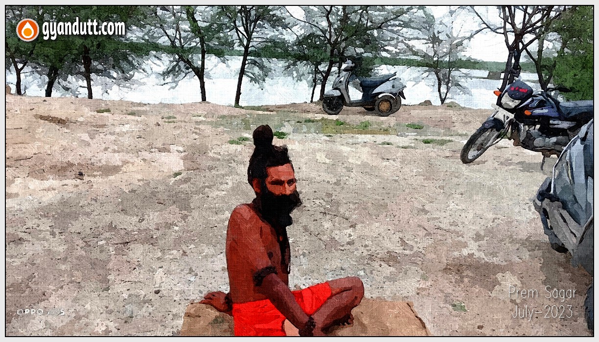 झील के पास डीह डूंगरी गांव के विश्रामपुरी जी महाराज का एक चित्र भेजा प्रेमसागर ने। विश्रामपुरी जी झील के किनारे एक बोरी बिछा कर बैठे हैं। अपने को जूना अखाड़ा का बताते हैं। उनके पास एक कुटिया भर है। प्रेमसागर को सोने के लिये सड़क किनारे एक बैंच मिली। उसपर गमछा बिछा कर रात गुजारी। अपने बैग का तकिया बनाया। भोजन के लिये विश्रामपुरी जी ने चरखी (चावल) में थोड़ी चीनी, नमक और हल्दी मिला कर बनाया था। वही खाया। “मैने कहा भी कि महराज यह क्या बना रहे हैं। पर जो बना था, वही खाये। और क्या करते भईया?”