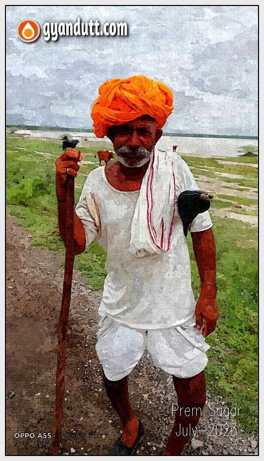 झील किनारे एक गड़रिया के चित्र भेजे प्रेमसागर ने। उनका साफा केसरिया रंग का है और शानदार लग रहा है। प्रेमसागर ने बताया कि यहां वृद्ध लोग सफेद साफा बांधते हैं। जवान लोग रंगीन। ये सज्जन तो अधेड़ लगते हैं। पर अभी भी अपने को जवान समझते हैं। उनके एक हाथ में लाठी और दूसरे में शायद छाता है।