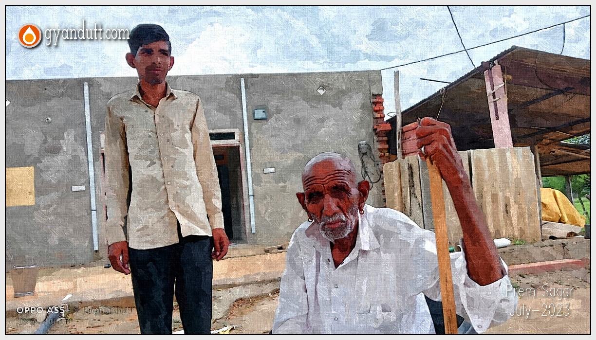 झील किनारे एक गांव, सांपों की ढाणी, में एक नौजवान प्रेमसागर को रोक कर केले खिलाये और भैंस का दूध, शहद मिला कर पिलाया। पिछले दिन फुलेरा में वह मिला था जहां प्रेमसागर चाय पीने के लिये रुके थे। प्रेमसागर से कुछ बातचीत हुई थी। उसे लगा था कि प्रेमसागर उसके गांव से गुजरेंगे। एक दर्जन केले का उसने इंतजाम किया था। प्रेमसागर को सड़क पर आते देख उसने रोका और घर पर बुला कर केला और दूध सामने रखा। “एक दर्जन केला था भईया। उतना कहां खाता। छ केला उन लोगों को ही खाने को दिया। उसके साथ न न करते हुये भी करीब एक किलो दूध उन लोगों ने मुझे पिला दिया। चित्र में नौजवान खड़ा है। पास में उसके पिताजी या दादा जी हैं। दादा जी ही होंगे। उनके माथे पर उम्र की रेखायें हैं और लम्बे कानों में कुण्डल। इस प्रकार का आतिथ्य कम ही मिलता है। राजस्थान में वह अपेक्षाकृत ज्यादा मिल रहा है।