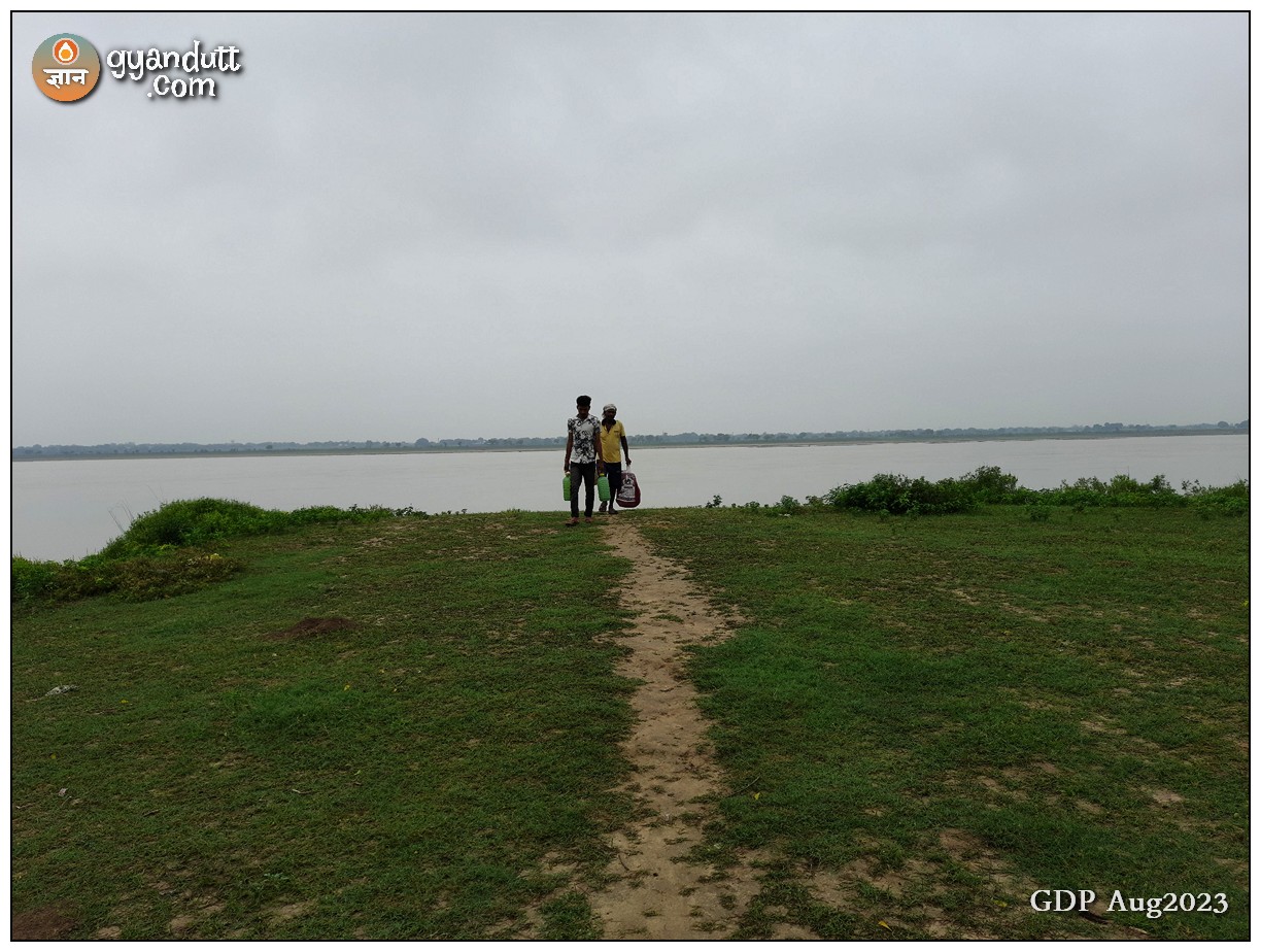 “नहाये कौन? ये (गंगा) इतनी गहरी हैं और इतना पानी है कि कब पैर फिसले, पता न चले। पानी लिये हैं। घर जा कर नहायेंगे।” – वे लोग जरीकेन में गंगा लिये जा रहे हैं। घर की सेफ्टी में गंगास्नान करेंगे। आज के जरीकेन-भागीरथ! भले ही उन्हें गंगा के जलबढ़ाव और बहाव में तेजी से भय लगता हो, गंगा के प्रति श्रद्धा तो है कि जरीकेन में तीस फुट से ज्यादा चढ़ाई चढ़ जल निकाल लाये हैं और घर तक ले जा रहे हैं। गंगा माई उनका कल्याण करेंगी। मेरा थोड़े जो दशकों से गंगा किनारे घूम रहा हूं पर कभी गंगा स्नान के लिये जल में नहीं उतरा।