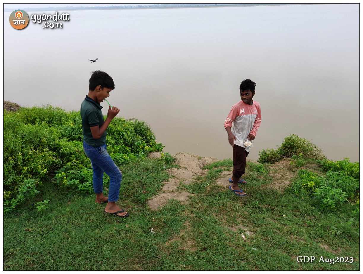 गंगा बढ़ी हैं। जल भी मटमैला है। दो बच्चे गंगा किनारे जा रहे थे। एक के मुंह में टूथब्रश था। दूसरे के हाथ में एक प्लास्टिक की पोटली। पोटली वाले ने कुछ धर्म-आध्यात्म की बात की। दोनों में वह कम ऊंचाई का था, पर शायद उम्र में बड़ा था। उसकी दाढ़ी-मूछें आ गयी थीं। किशोर वय। उससे पूछा तो बताया कि गंगा किनारे जा रहा है मछलियों को दाना खिलाने। यहीं पास में ही घर है। रोज आता है मछलियों को दाना डालने। इतने लोग आते हैं मछलियां पकड़ने – अपने बंसी-कांटे लिये। दूर दूर से। मोटर साइकिल पर। पर यह उनके उलट उन्हें दाना खिलाने आता है।