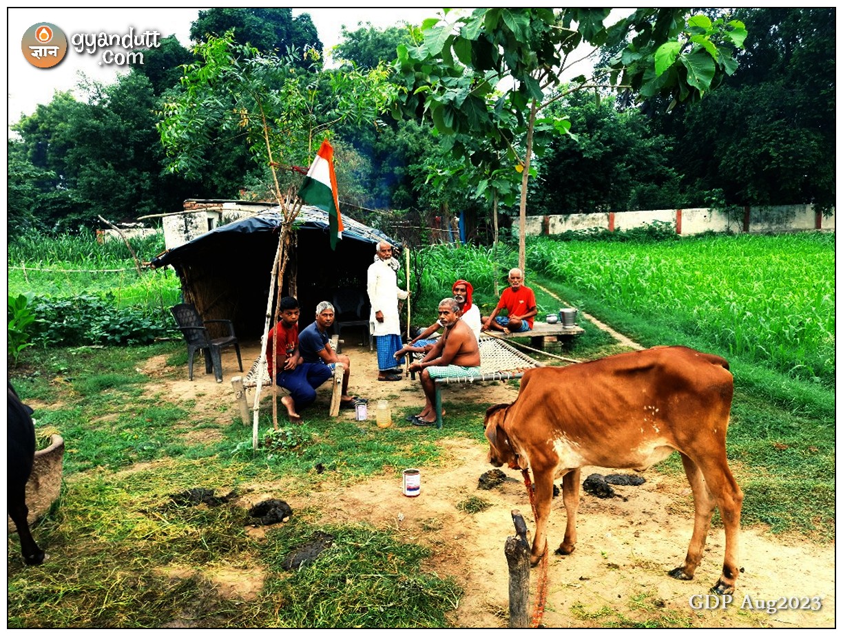 किनारे से लौटते एक झोंपड़ी के सामने आधा दर्जन लोग खटिया डाले बैठे बतकही करते दिखे। सवेरे सवेरे इतने लोग एक झोंपड़ी के सामने देख मुझे लगा कि शायद कोई चाय बनाने वाला हो और लोग चाय पीने आते हों। पर मैं भूल गया था कि यह ठेठ देहात है। यहां लोग सवेरे सवेरे चाय पीने के लिये किसी चाय की चट्टी पर जाने का रोग नहीं पाले हैं। उन्होने बताया कि कोई गमी हो गयी है। इसलिये वे वहां हैं। उनके बताते ही सवेरे का खुशनुमा, चाय तलाशता मेरा पैराडाइम झटके में बदल गया। आनंद का स्थान वैराज्ञ ने ले लिया। श्मशान पर तो कोई चिन्ह नहीं थे किसी दाह संस्कार के। शायद ये लोग मुस्लिम बस्ती के हों। ईंटवां में मुसलमान काफी संख्या में हैं। एक मजार/मस्जिद भी है।