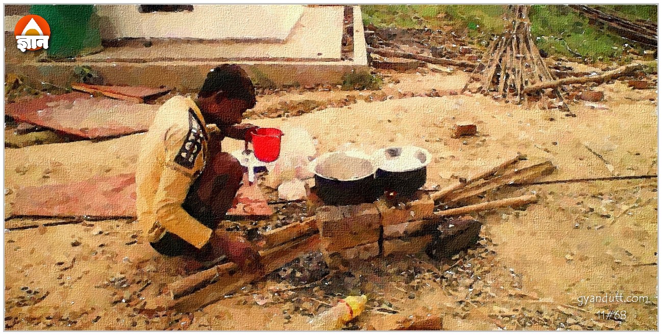चूल्हे का डिजाइन मिनिमलिस्ट है। उसमें दो कतारें हैं ईंटों की। बारह ईंटें जमा कर रखने से चूल्हा बन गया। चूल्हे में दोनो तरफ से लकड़ियांं लगाई गयी हैं। लकड़ियां भी पानी के टंकी बनाने में प्रयुक्त लकड़ी-बल्ली है।