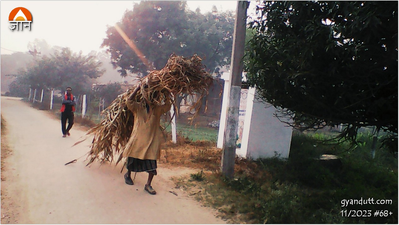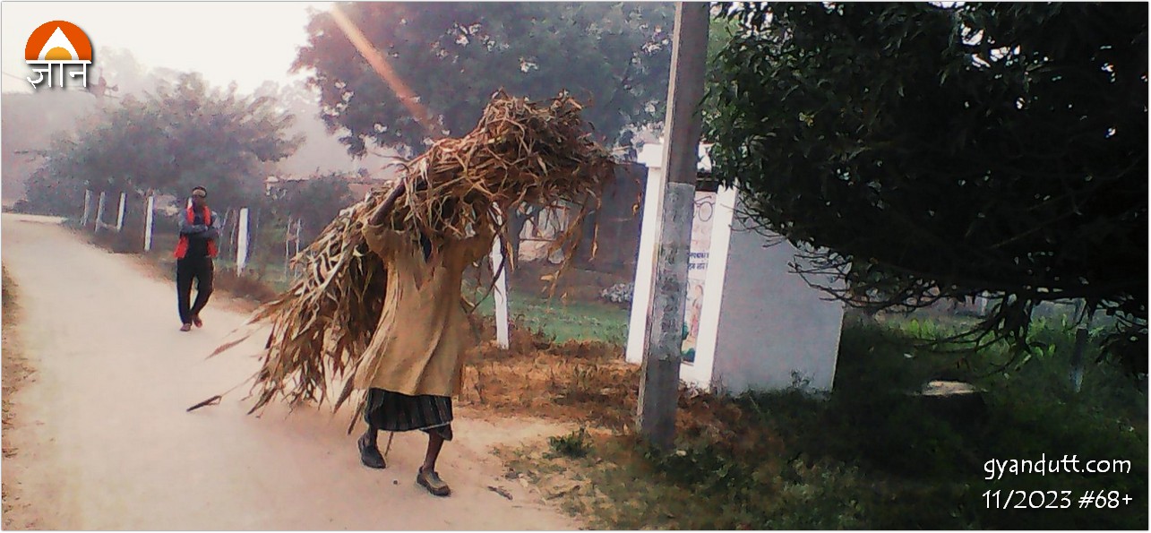 फसल की कटाई की गतिविधि सब तरफ नजर आती है। एक आदमी सगड़ी (ठेले) पर जोन्हरी के लकठे का बहुत बड़ा बोझ लादे है। मेरे द्वारा चित्र खींचने पर लजा सा जाता है। अपने से ही बताता है कि सिर पर ले कर जाता तो जितना लकठा है वह ढोने में पचास चक्कर लगाने पड़ते। “अब इस सग्गड़ से आठ दस फेरे में काम पूरा हो जायेगा।”