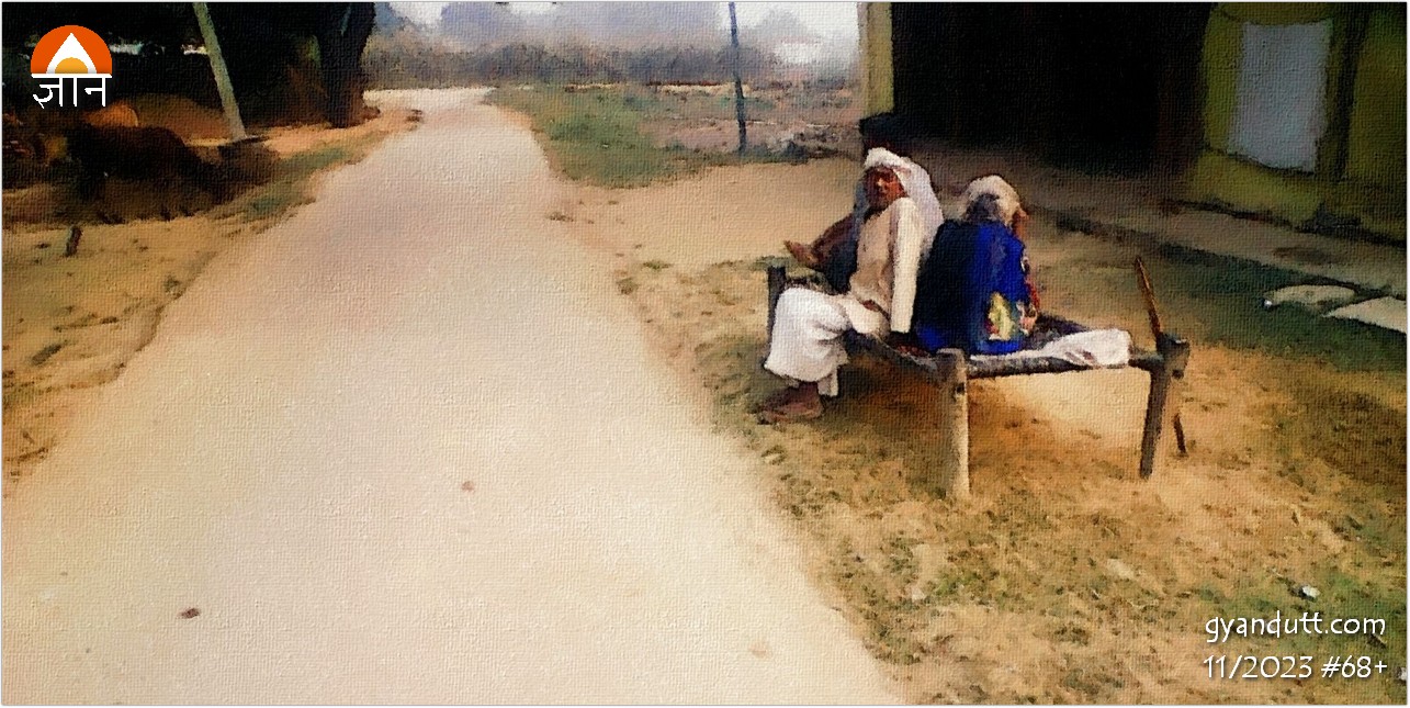 डईनिया में बाबूलाल और उसकी पत्नी दीखते हैं। बाबूलाल बूढ़ा है। कान से सुनता भी बहुत कम है। पहले आते जाते उसे खाट पर लेटे-ऊंघते पाया करता था मैं। दूसरी खाट पर उसकी पत्नी लेटी रहती थी। मुंह पूरी तरह खोले सोती हुई। पर आज उन दोनो को आपस में बोलते बतियाते पाया। पहले मुझे लगता था कि ये दोनो ज्यादा जीने वाले नहीं हैं। पर आज उनकी चैतन्यता और एक दूसरे से चोंच में चोंच डाल बतियाते देख मुझे विश्वास हो गया कि वे चलेंगे। एक दशक भर तो चलेंगे ही। उससे ज्यादा भी।