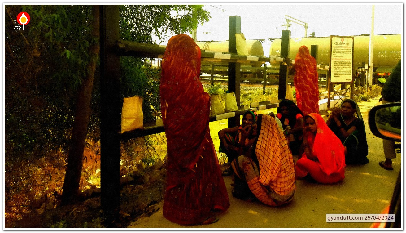 मेरी घर पर काम करने वाली महिला बताती है कि एक किशोरी जो अपनी सहेलियों के साथ गेहूं की कटाई के लिये जा रही है, सीजन में मजदूरी में दस-पंद्रह टीना (कनस्तर का टीन, जिसमें 13-14 किलो अनाज आता है) गेंहू संग्रह कर लेती है। जिस घर में लड़कियां हैं, वह घर खुशहाल रहता है। लड़कियां, आजकल काम मिलते रहने के कारण बोझ नहीं हैं परिवार पर। कष्ट तो उनकी शादी के बाद चले जाने पर है। पर क्या वास्तव में? रेल फाटक पर खड़ी इन आधा दर्जन औरतों को देख मुझे लगता है कि चाहे लड़कियां हों या शादीशुदा, औरतें घर की आय बढ़ाने में पूरा योगदान कर रही हैं।