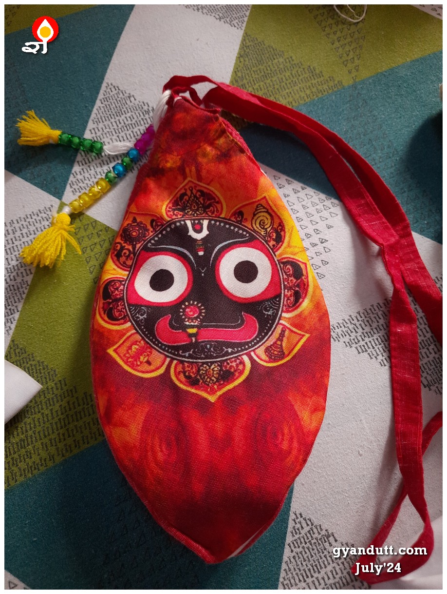 भगवान जगन्नाथ जी के चित्र वाली यह थैली बहुत सुंदर है। अपने घर के एकांत में इसका इस्तेमाल कर अभ्यास किया जायेगा। किसी सार्वजनिक अवसर पर तो करने से बचा जायेगा। अन्यथा लोग (वाजिब तौर पर) ढोंगी भक्त का लेबल चिपका ही देंगे। वैसे भी भगवन्नाम जप तो नितांत व्यक्तिगत साधना है। उसे वैसे ही होना चाहिये।