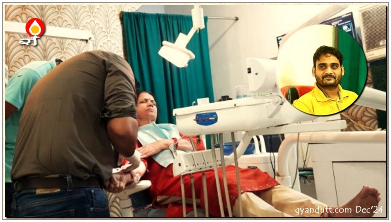 मेरे नीचे के इनसाइसर (काटने वाले दांत, कृन्तक) काले पड़ रहे थे। उनकी जड़ें ठीक थीं। ठंडा गरम भी इतना नहीं लगता था कि उसके उपचार की एमरजेंसी हो। पर काले दांत ऐसा आभास देते थे कि व्यक्ति तमाकू-सुरती-पानमसाला ज्यादा ही खाता है। जबकि मैं पान-सुरती खाता ही नहीं। मेरी मुस्कान और हंसी उत्तरोत्तर होठ दबा कर होने लगी थी – अप्राकृतिक। इनका इलाज कराने में प्रयाग के रेलवे अस्पताल जाने की सोच रहा था, पर प्रयागराज जाना, बार बार डाक्टर के अप्वाइंटमेण्ट पर अस्पताल में उपस्थित होना कठिन लग रहा था।