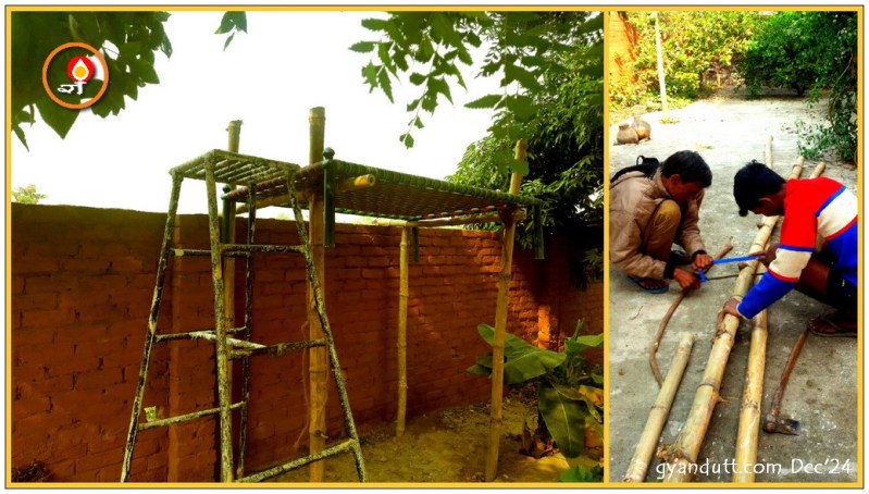 फिर सोचा खेत के बगल में ही मेरा घर है तो मचान घर की पिछली चारदीवारी से सट कर, घर में ही बनाया जा सकता है। बगीचे में बांस पर्याप्त पड़ा था, एक प्लास्टिक की निवार वाली खाट भी थी। सीढ़ी का काम देने वाली एक चौघड़िया भी थी। बस, बांस काट कर गाड़ने और उसपर खाट टांगने भर की देर थी और मचान बन कर तैयार। बांस काटने और गाड़ने-खाट टांगने का काम अशोक और राजा ने किया। अशोक मेरे वाहन चालक हैं और राजा सुग्गी का लड़का है। राजा पर एक पोस्ट लिखी जा सकती है।