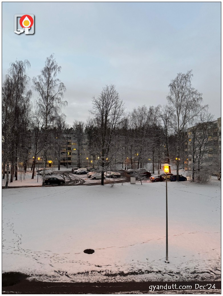 पिछले साल चुनचुन सर्दियों से परेशान लगती थी। कुछ कुछ भयभीत भी। तब उसके जीवन की वह पहली भयंकर सर्दी थी। अब तो वह फिनलैंड की दुनियां में रम बस गई है। वहां वह भारतीय त्यौहार भी मनाती है और स्थानीय भारतीय कम्यूनिटी से भी जुड़ी है। उसकी फिन्निश भाषा सिखाने वाली महिला का भी चित्र है जिसे वह अद्वितीय महिला बताती है। उसके भेजे चित्रों में बर्फ से ढंके घर और सड़कें हैं। वृक्ष भी बर्फीली पत्तियों वाले हैं। सभी बर्फ का कम्बल ओढ़े हैं – घर की छतें, झील के किनारे और चीड़ (?) के पेड़, सब।
