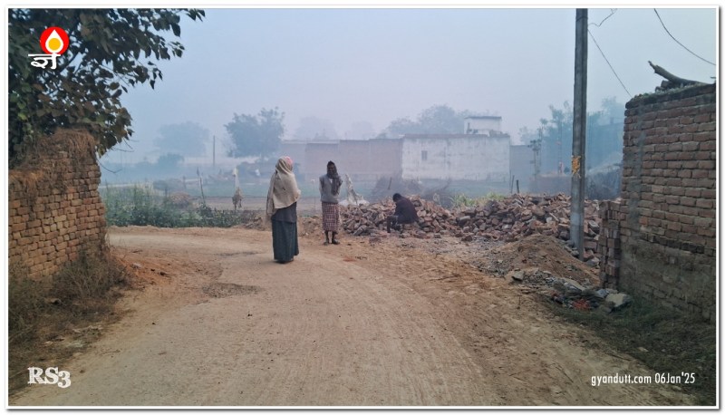 य्स दिन सवेरे जब हम अपना गेट खोलने गये तो आगे बढ़ गये सड़क पर। देखा कि रामसेवक अपनी जमीन के पास खड़े हैं। वे हल्के कोहरे में घुटने के थोड़े नीचे तक की लुंगी पहने थे। उन्होने मेरी पत्नीजी को बताया कि ऊपर उन्होने इनर और स्वेटर पहन रखा है और बस थोड़ी ही देर में स्नान कर पौने आठ बजे की पेसेंजर से ड्यूटी पर बनारस जायेंगे। (चित्र RS1)