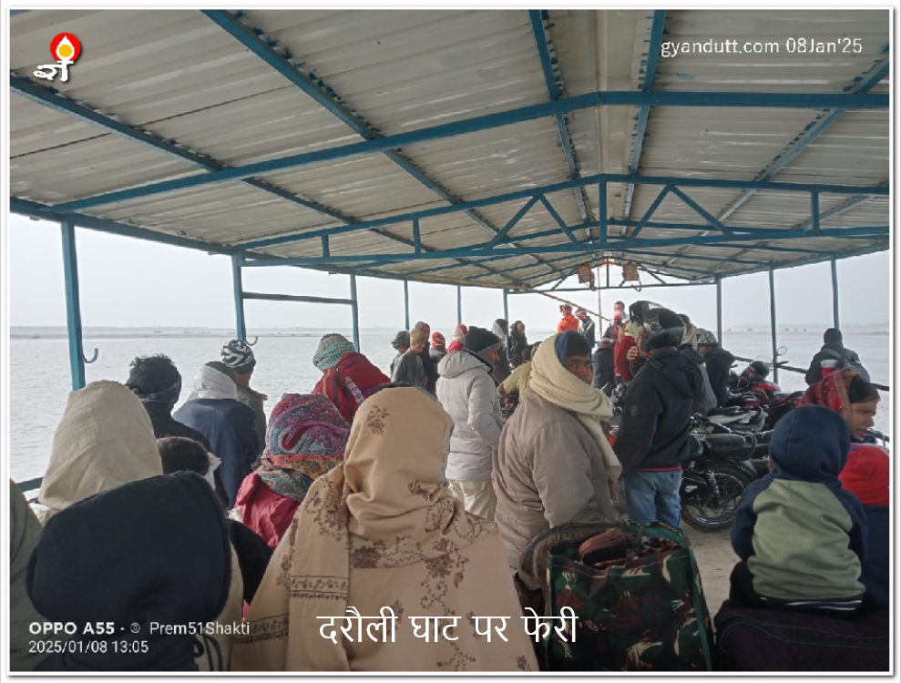 बीस किमी दूर दरौली घाट में इस साल पॉण्टून पुल अभी पूरी तरह बना नहीं है। सरयू (घाघरा) पार करने के लिये फेरी का इंतजार दो घंटे किया। फेरी बड़ी थी। सरयू भी बड़ी थीं। खूब पानी दीखता है। पाट भी बहुत चौड़ा है घाघरा/सरयू का। “दो किमी का होगा”।