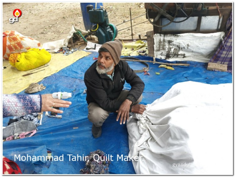 महुआरी में एक पुराने महुआ के पेड़ के नीचे दरी बिछा कर अपना उपकरण जमा रखा है मोहम्मद ताहिर ने। उन्होने बताया कि वे हैं तो दरभंगा, बिहार के; पर पुराने कपड़ों से ‘ऊन’ बनाने और उससे रजाई गद्दा बनाने का काम श्रीनगर, कश्मीर में करते थे। ताहिर की भाषा में कश्मीरी पुट है यद्यपि वे स्प्रिंग को सपरिंग नहीं उच्चारित करते।