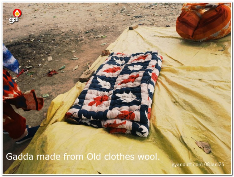 घर के बगल की महुआरी में आये हैं पुराने कपड़े से रजाई-गद्दे बनाने वाले। तीन दिन से डेरा किया है। मेरी पत्नीजी की सहायिका अरुणा अपने इक्कीस किलो पुराने कपड़ों से तीन रजाइयां बनवा लाई है। उसने हमें बताया तो हम (पत्नीजी और मैं) देखने गये।