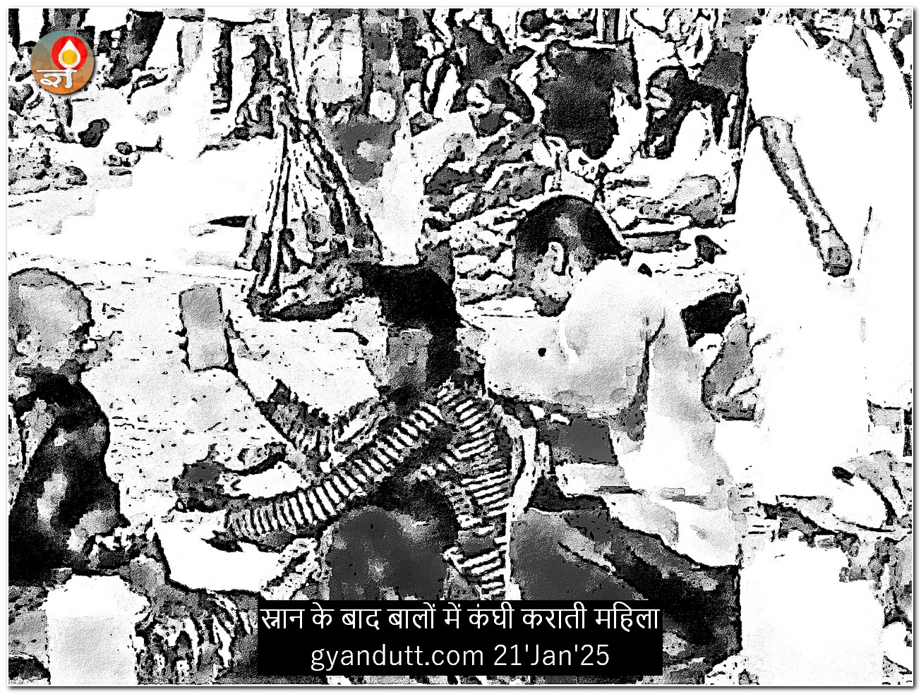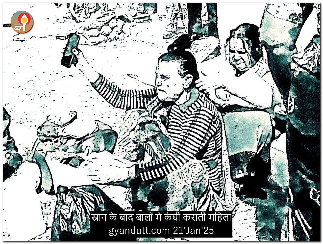 मेरे पीछे एक अधेड़ महिला दूसरी से कंघी करा रही थी। दोनो के चेहरों से लगता था कि पहाड़ की हैं। शायद गढ़वाली। वे कोई शहरी नहीं लगती थीं। महिला एक स्मार्ट फोन निहार रही थी। मुझे लगा कि वह स्मार्ट फोन के कैमरा का सेल्फी मोड प्रयोग कर रही है, बतौर दर्पण। पर जल्दी ही साफ हो गया कि वह कंघी कराते कराते किसी से वीडियो कॉल पर संगम का हालचाल बयान कर रही थी। अचानक वह उचक कर कैमरा नदी की ओर कर संगम की गतिविधि दिखाने लगी। अमवसा क मेला के चरित्र अब निश्चय ही बदल गये हैं। वीडियो कॉन्फ्रेंसिंग तक करने लगे हैं। युग इतनी तेजी से बदला है कि एक नया अमवसा का मेला लिखने वाला चाहिये!
