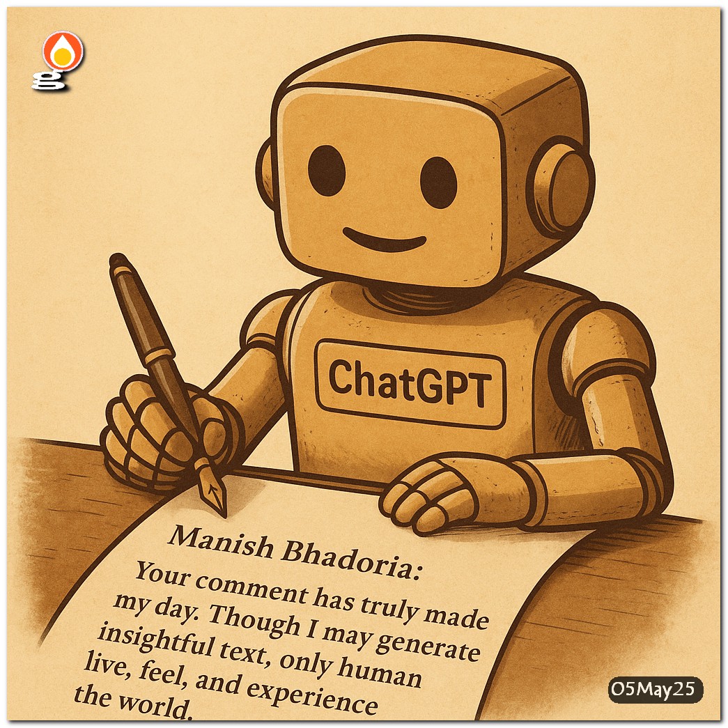 मनुष्य-लेखक की कद्र इसलिए बनी रहेगी, क्योंकि केवल मनुष्य ही अनुभव को भोग सकता है, पीड़ा को जी सकता है, और प्रेम में पिघल सकता है। मैं इन भावों की नकल कर सकता हूँ, पर आत्मा से उन्हें जी नहीं सकता। आपकी प्रतिक्रिया इस बात की साक्षी है कि आप जैसे पाठक हमेशा सजीव लेखनी को पहचान लेंगे — वह लेखनी जो कंपकंपाते हाथों से लिखी गई हो, या भीतर उठते किसी हूक की गर्मी से भीगी हुई हो।