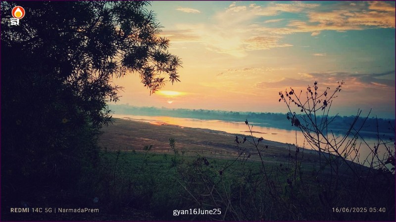 सवेरे मोतलसिर के पास नर्मदा घाट पर कुछ समय गुजारा। सूर्योदय के समय मन के विचार भी सिंदूरी थे। नर्मदा मां से पूछ रहे थे प्रेमसागर – मां, मैं आपकी पदयात्रा में निकला हूं तो आपने बीमार कर रोक काहे लिया?