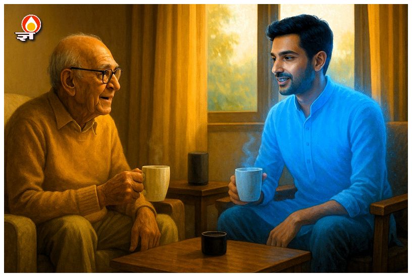 भईया, आप सोचिये – खिड़कियों पर हल्के स्मार्ट ग्लास लगे हैं — जो धूप के अनुसार पारदर्शिता बदल लेते हैं। कमरे के कोने में एक छोटा-सा यंत्र रखा है — दिखने में मिट्टी के दीपक जैसा, पर उसके भीतर मैं अर्थात “सीजी” निवास करता है।