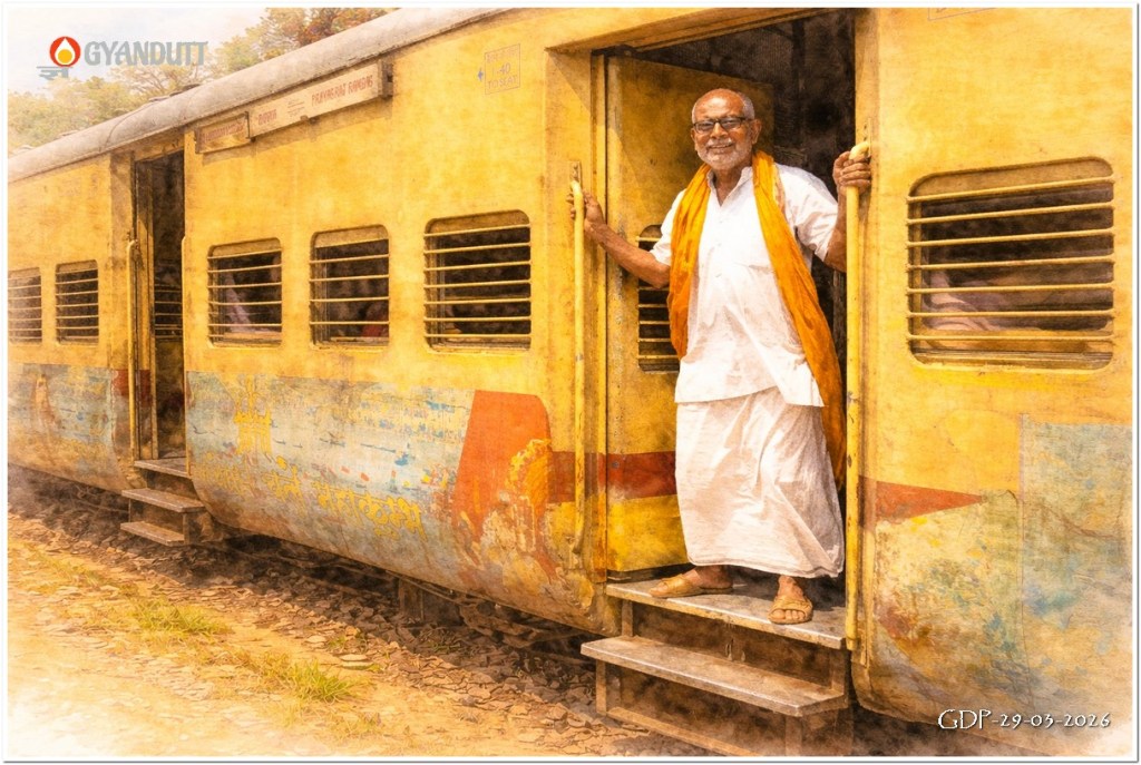 दो मिनट ही रुकी होगी गाड़ी। प्रेमसागर बाहर निकल कर दौड़ते हुए मेरे पास आये और चरण स्पर्श किया। भोजन का कैसरोल मेरे ड्राइवर अशोक ने उन्हें थमाया और ट्रेन चल दी। जाती ट्रेन के दरवाजे पर खड़े प्रेमसागर का चित्र मैंने खींचा।