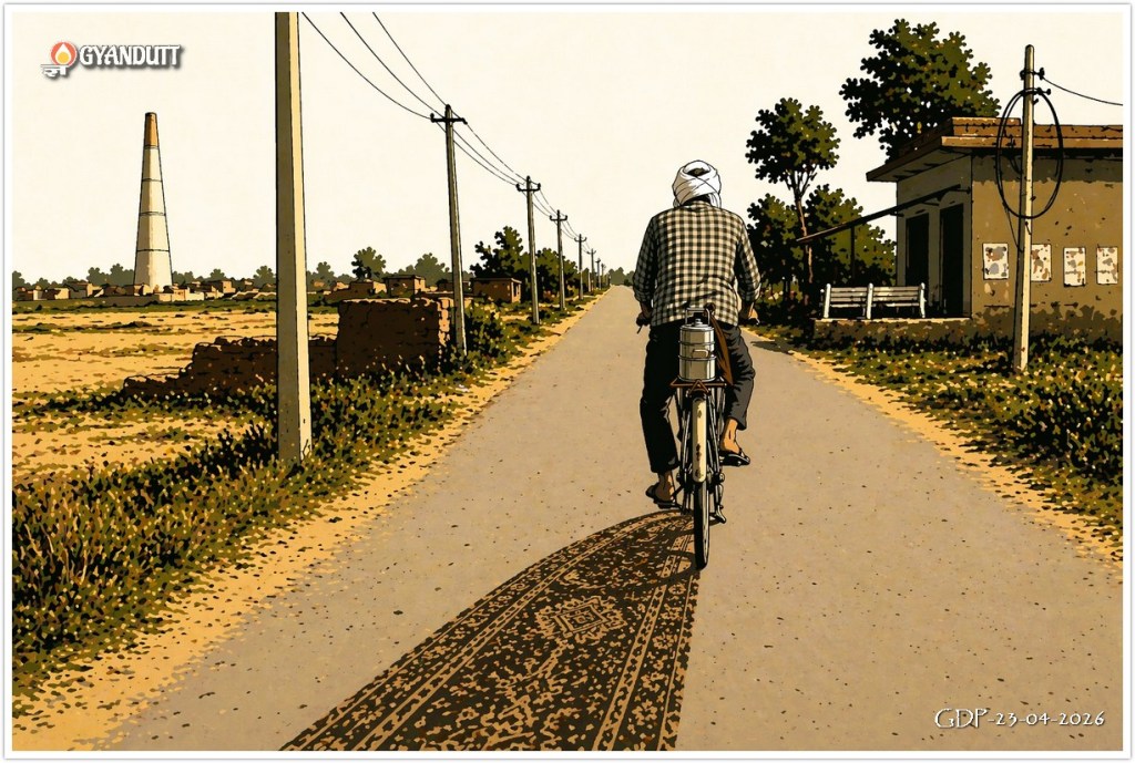 सामने एक आदमी साइकिल पर था — सिर पर गमछे का फेंटा बाँधे, पीठ सीधी, पीछे कैरियर में टिफिन दबाया हुआ। चाल में जल्दी थी, पर थकान भी। मैंने बिजली की साइकिल तेज़ की और बगल में आ गया।