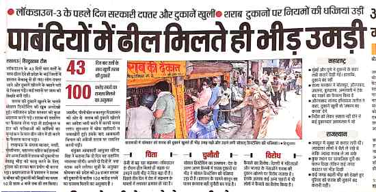 कल लॉकडाउन के दूसरे पक्ष की समाप्ति पर मदिरा की दुकानें खुलीं और उनपर पंहुचने वालों की भीड़ लग गयी। लोग बड़े बड़े पात्र खरीद कर लाते दिखे। कई स्थानों पर महिलायें भी मदिरा खरीदने की पंक्ति में लगी दिखीं। कुल मिला कर मीडिया-सोशल मीडिया पर यह बहुत रोचक प्रसंग के रूप में दिन भर चला। अगले दिन, आज, उसकी चार छ कॉलम की मुख्य हेडलाइन के रूप में अखबारों में रिपोर्ट है।
