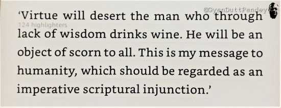 मनुष्य, जो अविवेक के वशीभूत हो कर, मदिरा पान करता है, सद्गुण उसका साथ छोड़ देते हैं। वह सभी के लिये उपहास का पात्र बन जाता है। मेरा यह संदेश पूरी मानव जाति के लिये है और इसे धर्मग्रंथ की अनिवार्य निषेधाज्ञा मानना चाहिये।