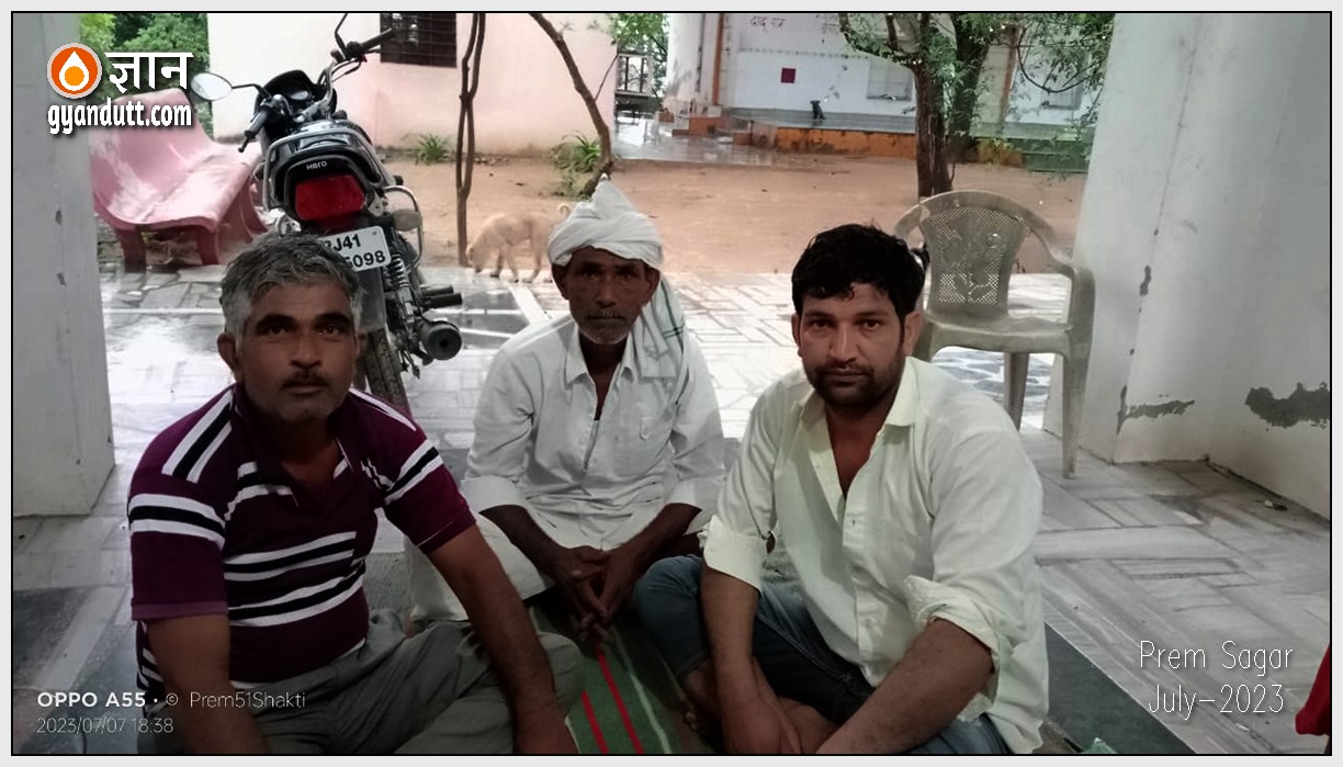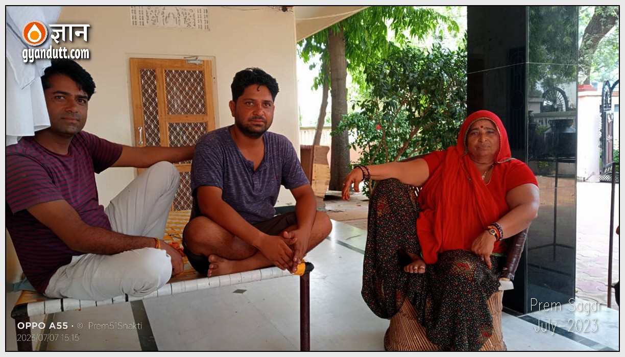 झील किनारे एक गांव, सांपों की ढाणी, में एक नौजवान प्रेमसागर को रोक कर केले खिलाये और भैंस का दूध, शहद मिला कर पिलाया। पिछले दिन फुलेरा में वह मिला था जहां प्रेमसागर चाय पीने के लिये रुके थे। प्रेमसागर से कुछ बातचीत हुई थी। उसे लगा था कि प्रेमसागर उसके गांव से गुजरेंगे। एक दर्जन केले का उसने इंतजाम किया था। प्रेमसागर को सड़क पर आते देख उसने रोका और घर पर बुला कर केला और दूध सामने रखा। “एक दर्जन केला था भईया। उतना कहां खाता। छ केला उन लोगों को ही खाने को दिया। उसके साथ न न करते हुये भी करीब एक किलो दूध उन लोगों ने मुझे पिला दिया। चित्र में नौजवान खड़ा है। पास में उसके पिताजी या दादा जी हैं। दादा जी ही होंगे। उनके माथे पर उम्र की रेखायें हैं और लम्बे कानों में कुण्डल। इस प्रकार का आतिथ्य कम ही मिलता है। राजस्थान में वह अपेक्षाकृत ज्यादा मिल रहा है।