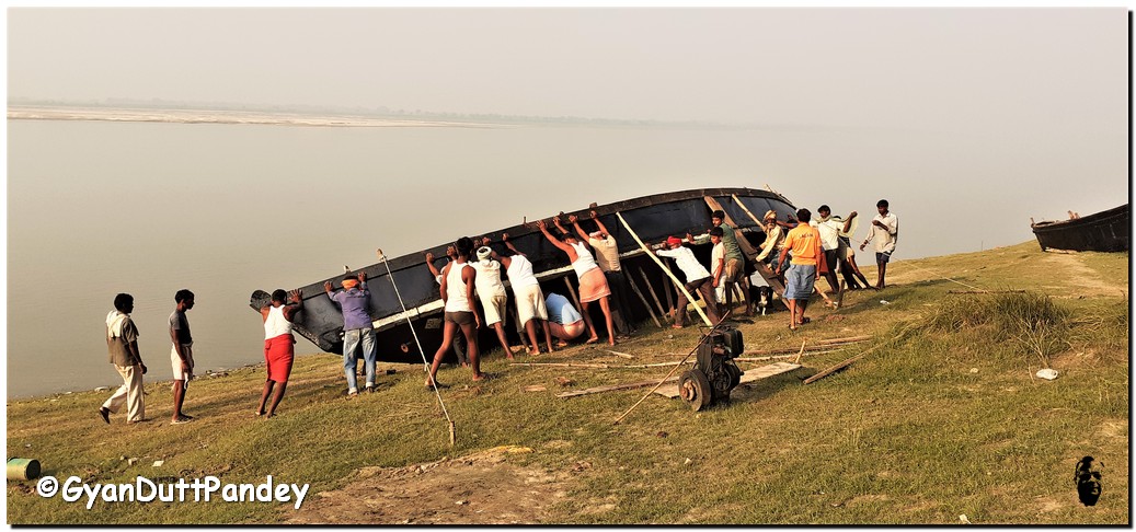 ठाकुर साहब ने बताया कि नियमानुसार हर साल नाव बरसात के महीने में (जब गंगा का पानी उतार पर हो, तब) किनारे जमीन पर उतार कर उसपर अलकतरा लगाना चाहिये। उससे नाव में जंग नहीं लगता और उसकी जिंदगी बढ़ जाती है।