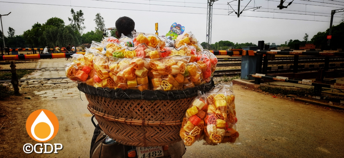खांची में कई छेदों वाली पूपली के कई पैकेट थे। एक पैकेट बीस रुपये का। खुदरा में दो रुपये का एक बेचते होंगे दुकानदार। उसका नाम फेरीवाले ने बताया – “लोग चिप्स कहते हैं पर हम उसे भिण्डा कहते हैं। कटी भिण्डी जैसा दिखता है।”