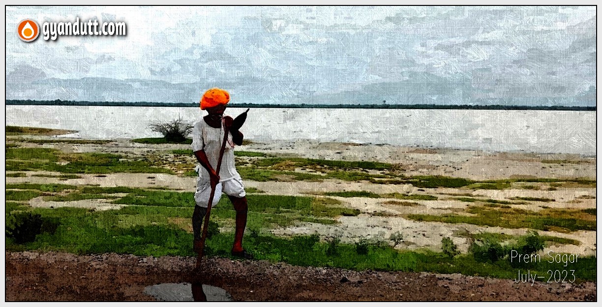 साम्भर झील किनारे एक गड़रिया के चित्र भेजे प्रेमसागर ने। उनका साफा केसरिया रंग का है, शानदार! प्रेमसागर ने बताया कि वृद्ध लोग सफेद साफा बांधते हैं। जवान रंगीन। ये सज्जन तो अधेड़ लगते हैं। पर अभी भी अपने को जवान समझते हैं।